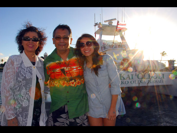 ผมรับรองว่าร้อยพันหมื่นแสนโชเฟอร์ต้องชื่นชอบเพลงนี้และชื่นชอบคนร้องด้วย ฮะแอ้ม !! แหมบรรยากาศมันเป็นใจอดรำลึกถึงอดีตไม่ได้ เอาละเดี๋ยวจะ go so big เป็นอันว่าคุณลิซ่าเธอก็พาลูกทัวร์มาส่งถึงท่าเรือ ก็มีเรือบริการอยู่หลายบริษัท เรือลำที่พาพวกเราท่องทะเลชื่อ KAI’ OLi’ OLI เป็นภาษาฮาวายแปลว่า Joy on the Ocean ตามธรรมเนียมก่อนออกทะเล กัปตันก็ออกมาแนะนำตัวเองและลูกทีม พร้อมทั้งแจกชูชีพและบอกถึงวิธีการที่จะต้องเซฟตี้ วันนั้นลูกทัวร์ในเรือเรามีกว่าสามสิบชีวิตประกอบด้วยหลายเชื้อชาติ นอกจากอเมริกันเจ้าของประเทศแล้ว ยังมียุโรป แคนาดา เอเซีย และที่ขาดไม่ได้เป็นยาดำคือญี่ปุ่นก็มากหน้าหลายตากว่าชนชาติอื่น วันนี้เขาจะพาเราไปสน๊อกเกอร์ดูเต่าหอยปูปลา ดูประการัง และถ้าโชคดีอาจได้เห็นปลาวาฬและโลมาออกมาเล่นน้ำ อย่าถามผมนะครับว่าเขาพาเราไปไหนบ้าง เรื่องภูมิศาสตร์ทางทะเลกับผมนี้ไม่ประสีประสากันเลย รู้แต่ว่าวันนั้นท้องฟ้าเป็นใจอากาศแจ่มใส ดูวิวทิวทัศน์ชื่นอกชื่นใจ ทำให้นึกถึงเพลงสุนทราภรณ์ท่อนที่ว่า.. “ร่อนเร่ไปกลางทะเลชาวฮาเย็นเฮกันกลางทะเล” มีอีกเวอร์ชั่นหนึ่งแวบมาในหัวว่า.. “เฮ อยากจะเอา....ไปทิ้งทะเล เป็นเหยื่อปูม้าและปูทะเล เห่ เห่ เฮ เฮ เห่เฮ้” แหะๆ ตรงที่จุดๆ เว้นไว้ จะเอาใครไปทิ้งก็เติมเอานะขอรับ ผมไม่เกี่ยว และเพลง..ตังเกของน้าหมู (พงษ์เทพ กระโดนชำนาญ) ก็ได้อารมณ์ดีอย่ากล่าวหาว่าผมแชเชือนนะครับบรรยากาศมันพาไป