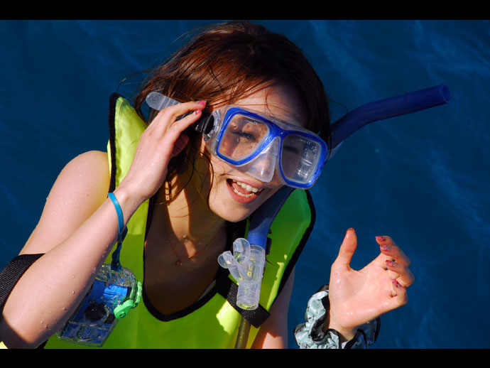 แล้วเรือก็พาเรามาถึงจุดหมายที่จะได้ชมประการัง พอเรือจอดนิ่งสาวน้อยในทีมงานก็คว้าเชือกหัวเรือผูกบั้นเอวกระโดดน้ำตูม ดำน้ำเอาเชือกไปผูกกับหินใต้น้ำ ลูกทีมที่เหลือก็แจกจ่ายอุปกรณ์เครื่องช่วยหายใจและหน้ากาก ผมเตรียมตัวมาแล้วเพราะมีประสบการณ์ตอนไปเที่ยวตรังและกระบี่ ถอดเสื้อฮาวายออกใส่ชูชีพ ใส่อุปกรณ์ทุกอย่าง ลูกสาวผมที่มาจอยด้วยก็เรียบร้อยพร้อมที่จะลง เธอเอา iphone ใส่หน้ากากกันน้ำ (water proof case) ติดตัวไปด้วยเพื่อเก็บภาพใต้น้ำ มองไปมองมาเอ้า..แม่คุณของผมเธอยังไม่เรียบร้อยเลย ผมต้องไปช่วยใส่ชูชีพและสน๊อกเก้อร์ให้พร้อมทั้งสอนให้หายใจทางปาก และมีอีกอย่างหนึ่งที่น่าสนใจสำหรับผู้ที่ไม่คุ้นเคยกับทะเล มีฟองน้ำแท่งยาวๆ กลมเหมือนไม้พองเส้นผ่าศูนย์กลางสักสองนิ้ว ผมไม่ลืมที่จะคว้าติดตัวและให้แม่บ้านนำลงน้ำไปด้วย เพราะคำว่าคืบก็ทะเล ศอกก็ทะเล อย่าไว้ใจทาง อย่าวางใจทะเล หนึ่งสองสามทุกอย่างพร้อมที่จะลงไปผจญกับความตื่นเต้น หนุกหนาน หนุกหนาน ท้องน้ำราบเรียบ คลื่นลมสงบ ผมค่อยๆ ประคองแม่บ้านลงบันไดจับเชือกที่โรยไว้ ในกรณีที่กลัวว่าจะออกไปไกลจากเรือ แม่บ้านผมไม่มีประสบการณ์เลย กลัวๆ กล้าๆ มัวแต่เทคแคร์เธอ มองไปอีกทีแม่ลูกสาวผมออกไปไกลแล้ว เสียงเรียกมาให้พ่อกับแม่รีบลงมาเร็วๆ พอแตะน้ำยังไม่ทันเท่าไร แม่บ้านผมก็ไม่เอาแล้ว พ่อช่วยพาขึ้นเรือที ลูกทีมของเรือก็เข้าช่วยดูแลมาพยุงเธอขึ้นเรือ ยืนตัวสั่นเป็นลูกนกตกน้ำ ผมถามว่าเป็นไรไป เธอบอกว่า..หายใจไม่ออก สำลักน้ำ ถอยดีกว่า ไม่อาว..ดีกว่า อยู่ไปเดี๋ยวเป็นภาระของคนอื่น พี่ไปเล่นเถอะน้องจะถ่ายรูปให้ เออ..ก็ดีเหมือนกัลล์