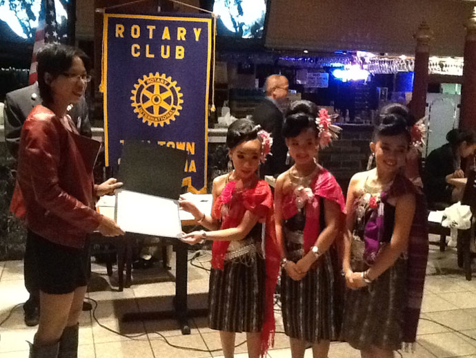 สโมสรโรตารี่ไทยทาวน์ เมื่อวันจันทร์ที่ผ่านมาคึกคักกว่าทุกคราว เพราะมีโครงการคัดเลือกเด็กที่มีความสามารถ เข้าไปแข่งขันในงานโรตารี่สากลประจำปี 2013 โดยเปิดรับสมัครนักเรียน High School ระดับ Freshman Sophomore หรือ Junior เพื่อที่จะสปอนเซอร์ส่งไปร่วมใน Rotary Youth Leadership Assembly ที่ Blue Jay, CA ช่วงวันที่ 26-28 เมษายน หมดเขตรับสมัครวันที่ 15 กุมภาพันธ์ ติดต่อได้ที่ info@rotaryclubofthaitown.org หรือ 323-908-6206 จุดประสงค์เพื่ออบรมสร้างคนหนุ่มสาวในหลายด้านเพื่อเป็นผู้นำในอนาคต........* สำหรับสัปดาห์ที่ผ่านมา ผู้ชนะเลิศในการประกวดได้แก่การรำโปงลางของหนูน้อยวัยละอ่อน นำโดย