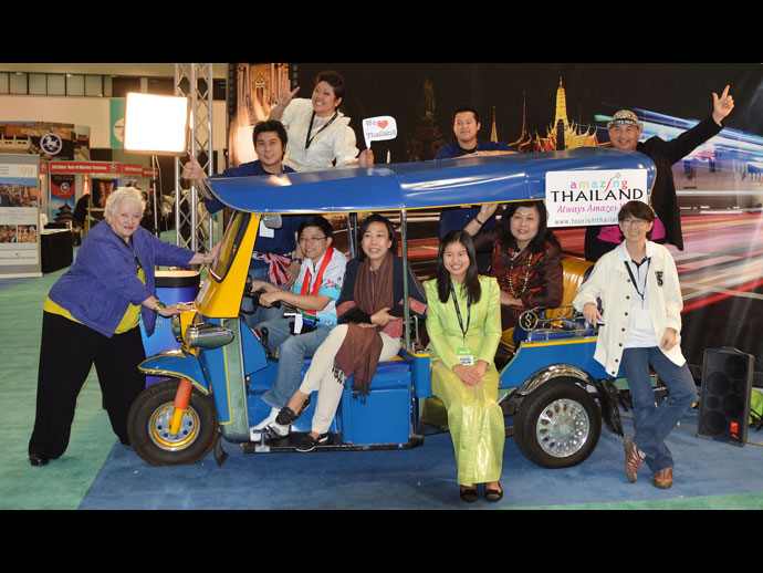 สุดเศวต เศวตะโศภณ ผู้จัดการการบินไทยประจำภูมิภาคอเมริกา ในโอกาสเข้าร่วมงาน LA Times Travel Show 2013........* งานนี้เป็นงานส่งเสริมการท่องเที่ยวประจำปี 2013 ของนครลอสแอนเจลิส โดยในงานมีผู้แทนภาครัฐและเอกชนของประเทศต่าง ๆ เข้าร่วมจัดนิทรรศการและเสนอขายรายการท่องเที่ยวรูปแบบหลากหลาย อาทิ เกาหลี ญี่ปุ่น มาเลเซีย อินโดนีเซีย เอกวาดอร์ ไต้หวัน และอาฟริกาใต้ เป็นต้น……..* ททท.ลอสแอนเจลิสนอกจากนำผู้ประกอบการท่องเที่ยวมาร่วมส่งเสริมการขาย ทั้งโปรแกรมฮันนีมูน กอล์ฟ กิจกรรมท่องเทียวผจญภัย ท่องเที่ยวในแหล่งมรดกโลกในประเทศไทยแล้ว ยังได้นำเอกลักษณ์ที่เป็นที่รู้จักดีของประเทศไทย คือ รถสามล้อเครื่อง(ตุ๊ก ตุ๊ก) มาเป็นไฮไลท์ของงานอีกด้วย……..* ประธานชมรม Thai Town Hollywood Golf Club