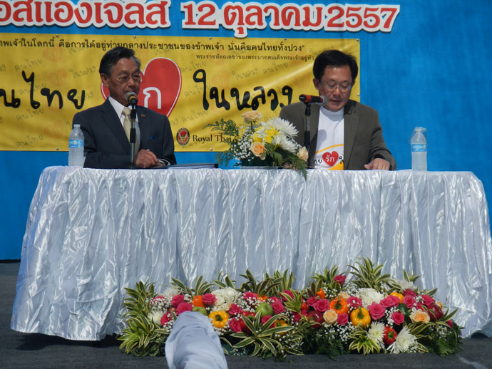 “พระมหากษัตริย์กับชาติไทย” ที่วัดไทยลอสแองเจลิส เมื่อวันอาทิตย์ที่ 12 ตุลาคม 2557 มีคนไทยไปร่วมให้การต้อนรับและรับฟังกันแน่นขนัด ด้วยความศรัทธาในตัวอดีตผู้นำของประเทศไทยผู้นี้.......* และในวันจันทร์ที่ 13 ตุลาคม 2557 อดีตนายกฯ