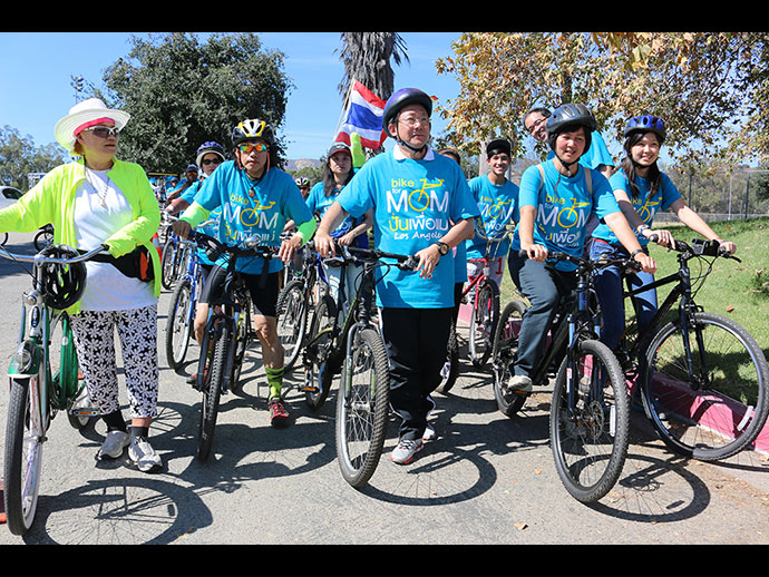 “ปั่นเพื่อแม่” ที่คนไทยทั่วโลก ร่วมกันเทิดพระเกียรติ”แม่ของแผ่นดิน คนไทยในแอลเอ อุ้มลูกจุงหลาน ขี่จักรยานหรือเอารถยนต์บรรทุกจักรยานไปร่วมชุมนุมกันที่ Griffith Park, Los Angeles เกือบ 300 คน โดยมีกงสุลใหญ่