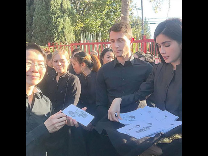 ไปรยา สวนดอกไม้ นางเอกละครโทรทัศน์ชื่อดัง และกำลังเลื่อนขั้นมาเป็นนางแบบระดับอินเตอร์ ที่มีผลงานทั่วไปทั้งในสหรัฐอเมริกาและประเทศอื่นๆในยุโรป รวมทั้งกำลังจะเป็น “แบรนด์” แอมบาสซาเดอร์ของสินค้าระดับแนวหน้าของโลก “ปู” มาเป็นจิตอาสายืนแจกอาหาร เครื่องดื่ม และแผ่นพับ ด้วยใบหน้าอันยิ้มแย้มแจ่มใส เสียดายที่เราไม่ได้พบกัน……..* งานพระราชพิธีถวายดอกไม้จันทน์ในวันนั้น ทุกคนต่างก็มีความอาลัย ต่อ