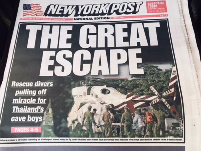 หนังสือพิมพ์ ไทยแอล.เอ. ฉบับนี้ประจำวันเสาร์ที่ 21 กรกฎาคม 2561 ตรงกับวันขึ้น 9 ค่ำ เดือนแปด (8) ปี จอ ……..* ยังกระหึ่มไปทั่วโลก เกี่ยวกับเรื่องราวของทีม "หมูป่าอะคาเดมี่ " ที่ได้รับแรงใจและการช่วยเหลือจากคนทั่วโลกนำออกมาจากถ้ำหลวงขุนน้ำนางนอน อ.แม่สาย จ.เชียงราย มีแต่คนปลื้มปิติที่เด็กเหล่านี้รอดพ้นจากอันตรายมาได้อย่างชนิดใจหายใจคว่ำ คนทั่วโลกต่างพากันสวดมนต์ภาวนาให้สิ่งศักดิ์สิทธิ์ทั้งหลายคุ้มครองป้องกันเด็กเหล่านี้……..* เมื่อเด็กออกมาได้แล้ว บุคคลต่างๆที่มีส่วนเกี่ยวข้องในการวางแผนและช่วยเหลือจนประสบความสำเร็จ เสียงแซ่ซ้อง สรรเสริญ สดุดี ผู้กล้าหาญทั้งหลายที่เข้าไปช่วยเด็กออกมาได้อย่างปลอดภัย และผู้ที่เรายกย่องสรรเสริญมากที่สุดได้แก่