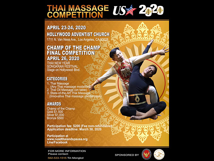 แข่งขันชิงแชมป์นวดไทยแห่งสหรัฐอเมริกา ซึ่งจัดขึ้นเป็นครั้งแรก ในวันที่ 23-24 เมษายน 2020 ได้เชิญกรรมการตัดสินจาก