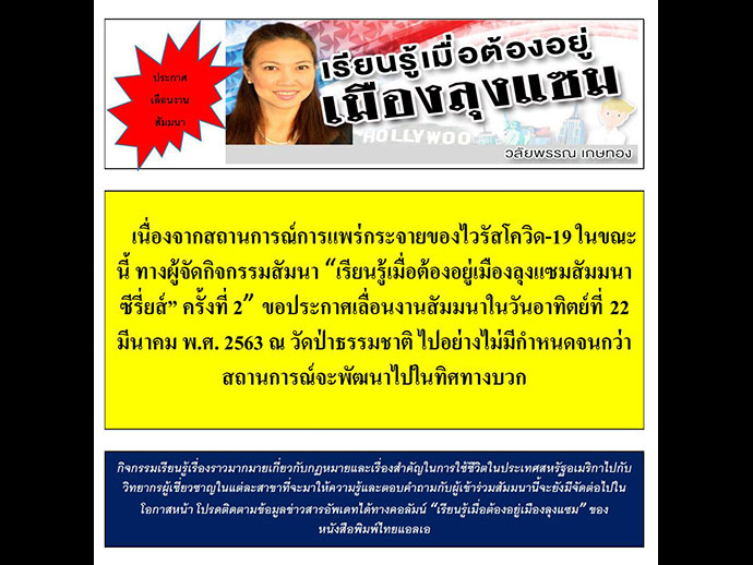 รอสลิน ปัทมคันธิน วาสเควส ในฐานะประธานจัดงานฯ ได้ประกาศผ่านเว็บไซต์ และแอพลิเคชั่นไลน์ขององค์กรฯ ว่ามีความจำเป็นต้องเลื่อนการจัดงานไทยนิวเยียร์เดย์ฯ ประจำปี 2020 ออกไปเป็นเดือน กรกฎาคม หรือ สิงหาคม ทั้งนี้เพราะความกังวลเกี่ยวกับการแพร่กระจายของไวรัสโคโรน่าสายพันธุ์ใหม่ หรือโควิด-19 ตรวจสอบวันจัดงานที่แน่นอน ผ่านเว็บไซต์(thainewyear.org)……..* สภาหอการค้าฯ และสมาคมนวดไทยฯ ได้เฝ้าติดตามสถานการณ์ เกี่ยวกับ การระบาดของโรค Covid-19 เพื่อความปลอดภัยของพี่น้องชุมชนไทยทุกท่าน จึงมีมติร่วมกันและเห็นควรเลื่อนงานสัมมนา AB5 ในวันอังคารที่ 17 มีนาคม 2563 ออกไป จนกว่าสถานการณ์จะกลับเข้าสู่ภาวะปกติ โดยสมาคมฯ จะแจ้งหมายกำหนดการใหม่ให้ทราบอีกครั้ง……..*
