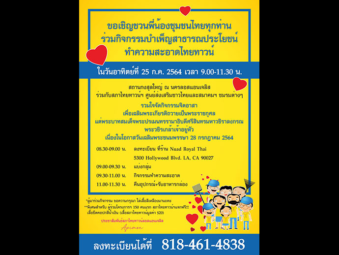 การให้บริการกงสุลสัญจร นัดพิเศษ ณ วัดป่าธรรมชาติ เมืองลาพวนเต้ มลรัฐแคลิฟอร์เนีย สถานกงสุลใหญ่ ณ นครลอสแอนเจลิส ขอเชิญคนไทยในนครลอสแอนเจลิส และพื้นที่ใกล้เคียงเข้ารับบริการกงสุลสัญจร นัดพิเศษ โดยมีกำหนดการ วันที่ 7 – 8 สิงหาคม 2564 เวลา 09.00 – 17.00 น. 14036 Don Julian Rd, La Puente, CA 91746 โทรศัพท์ (626) 336-2224 สามารถดูรายละเอียดขั้นตอนต่างๆได้ที่ www.thaiconsulatela.org ก่อนเข้ารับบริการ……..* ขอเชิญชวนพี่น้องชุมชนไทยทุกท่าน ร่วมกิจกรรมบำเพ็ญสาธารณประโยชน์ทำความสะอาด ไทยทาวน์ ในวันอาทิตย์ที่ 25 ก.ค.2564