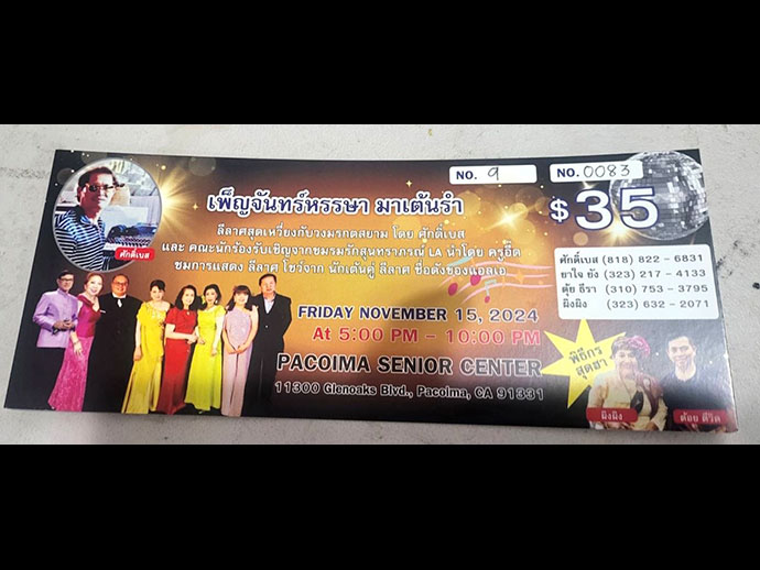 กำหนดจัดงาน วันอาทิตย์ที่ 17 พฤศจิกายน 2024 เวลา 3 PM- 7 PM สถานที่: Norman P. Murray Community Center 24932 Veterans Way, Mission Viejo, CA 92692 ลุ้นรับรางวัลใหญ่จากหางบัตร และร่วมสนุกในกิจกรรม RAFFLES, เพลิดเพลินกับการรับประทานอาหาร ชมการแสดง เต้นรำ และร้องเพลง บัตรราคา $59 ติดต่อสอบถามได้ที่