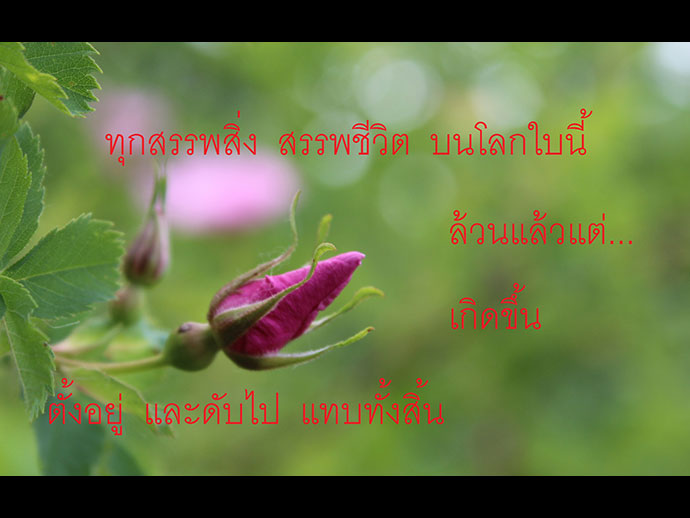 ขณะกำลังรดน้ำต้นไม้ เราเห็นดอกไม้ดอกหนึ่งกำลังบานสะพรั่ง (ดอกไม้ดอกนั้นเกิดขึ้นแล้ว) วันรุ่งขึ้นดอกไม้ก็ยังเบ่งบานท้าทายฝูงผึ้งและแมลงต่าง ๆ (ตั้งอยู่) 2-3 วันต่อมา ดอกไม้ดอกนั้นก็เหี่ยวเฉาร่วงโรยไป (ดอกไม้นั้นก็ดับสลาย)