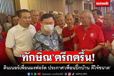 ผู้สื่อข่าวรายงานว่า สำหรับบรรยากาศภายในห้องจัดเลี้ยงชั้นสองของภัตตาคารเป็นไปอย่างชื่นมื่นและคึกคัก โดยเมื่อนายทักษิณ มาถึงบริเวณชั้น 2 ของภัตตาคาร กลุ่มเพื่อนและญาติๆ มารออยู่แล้ว ซึ่งส่วนใหญ่สวมเสื้อสีแดง และทันทีที่นายทักษิณ เดินเข้าไปภายในห้อง ทุกคนได้ปรบมือและส่งเสียงเฮ พร้อมตะโกนว่า "ขอต้อนรับนายทักษิณ" โดยมีตัวแทนเพื่อนศิษย์เก่าจากโรงเรียนมงฟอร์ตวิทยาลัย ที่นายทักษิณเคยศึกษาตั้งแต่ตอนเด็ก ถือป้ายข้อความขนาดใหญ่ว่า "ขอต้อนรับเพื่อนปิ๊กบ้าน ดีใจ๋ขนาด" พร้อมมอบช่อดอกกุหลาบสีแดงและพวงมาลัยดอกมะลิ น้ำผึ้ง และของที่ระลึกเป็นน้ำผึ้งป่า ให้กับนายทักษิณ เพื่อเป็นการต้อนรับ