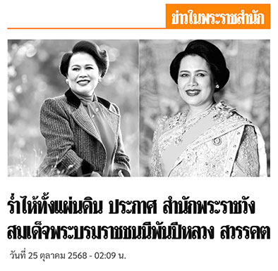 เมื่อเวลา 01.58 น. วันที่ 25 ตุลาคม 2568 สำนักพระราชวังออกประกาศว่า สมเด็จพระนางเจ้าสิริกิติ์ พระบรมราชินีนาถ พระบรมราชชนนีพันปีหลวง สวรรคต ความว่า