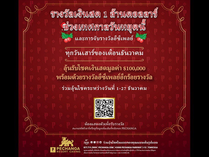- มาร่วมลุ้นจับรางวัลใหญ่ในช่วงเทศกาล มูลค่าล้านดอลลาร์ที่ Pechanga Resort Casino