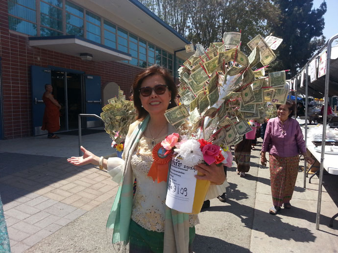 ธรรมปัญญา รองครูใหญ่โรงเรียนพุทธศาสนาวัดไทยลอสแองเจลิส มอบเงิน 1,200 เหรียญ กำไรจากการตั้งบูชทอดกล้วยแขกให้งานเทศกาลเย็นทั่วหล้ามหาสงกรานต์วัดไทยฯ ให้กับน้องๆ ครูอาสาประจำการ 1 ปี เพื่อเป็นค่าใช้จ่ายในการทัศนศึกษา…….* ผลการประกวดนางสงกรานต์สืบสานประเพณีไทย ของวัดโพธิวารีรังสฤษฎ์ ซึ่งมี