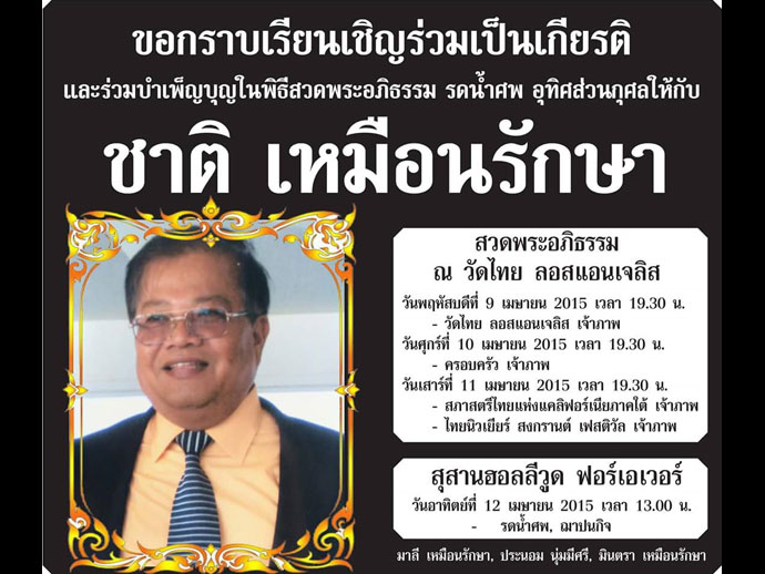 รุจิลาภา เสาร์นี้ตรงกับวันเสาร์ที่ 4 เมษายน 2558 ……..* เริ่มสัปดาห์ของเทศกาลสงกรานต์ ที่จะมีการเฉลิมฉลองเกิดขึ้นใน แอล.เอ งานแรกเป็นงานใหญ่ระดับประเทศ ที่จัดขึ้นทุกปี อาทิตย์แรกของเดือน ซึ่งปีนี้ตรงกับวันที่ 5 เมษายน งานจัดขึ้นบนถนนฮอลลีวูด ระหว่างถนน Western-Normandie จะมีผู้มาร่วมงานนับหมื่นๆ คน ซึ่งจะมีทั้งชาวไทยและชาวต่างชาติ ที่ให้ความสนใจ และมาชมประเพณีแบบไทยๆ........* การจัดงานไทยนิวเยียร์สงกรานต์เฟสติวัล ประจำปี 2015 ซึ่งตรงกับวันอาทิตย์ที่ 5 เมษายน 2015 นั้น โดยทุกครั้งก่อนที่จะมีงาน ทางสถานกงสุลใหญ่ ณ นครลอสแองเจลีส ร่วมกับคณะกรรมการจัดงานไทยนิวเยียร์สงกรานต์เฟสติวัล จะจัดเลี้ยงต้อนรับ คณะผู้บริหารที่สนับสนุนงานไทยนิวเยียร์ฯ คณะดารานักแสดงนักร้องจากประเทศไทย พร้อมกับเจ้าหน้าที่ฝ่ายภาครัฐของเมืองลอสแองเจลีส ภาครัฐแคลิฟอร์เนีย และสื่อมวนชนทุกแขนง เพื่อแถลงการทำงานที่ผ่านมา และแนะนำคณะกรรมการจัดงาน ทางด้านต่างๆ แนะนำดารานักแสดงนักร้องจากประเทศไทย สำหรับในปีนี้ จะจัดงานเลี้ยงต้อนรับ ในวันเสาร์ที่ 4 เมษายน 2015 ณ ทำเนียบกงสุลใหญ่ นครลอสแองเจลีส เลขที่ 621 South Lorraine Blvd., Los Angeles, California 90004 เวลา 18.00 น. ........* อาทิตย์ถัดไป 11-12 เมษายน งานสงกรานต์วัดไทยชมการประกวดเทพีสงกรานต์ การแสดงศิลปะและวัฒนธรรม ชิมอาหารเลิศรส เลือกซื้อสินค้าของที่ระลึกถูกใจ ร่วมตักไข่การกุศลลุ้นรางวัลใหญ่ ก่อพระเจดีย์ทราย สรงน้ำพระ ทำบุญผ้าป่าสามัคคี สร้างศูนย์ศิลปะและวัฒนธรรมไทยแห่งแรกประจำเมืองแอลเอ พบกับมิ้นท์ AF 3 พิธีกร บันเทิง 5 หน้า 1 ของช่อง 5 ดาราและนักร้อง วิน วีรชัย วีระ บำรุงศรี นักร้องจากเมืองไทย วงดนตรีร็อค HITMAN วัดไผ่ล้อมนครปฐม และกิจกรรมอื่นๆ อีกมากมาย........* คำคม ประจำสัปดาห์นี้