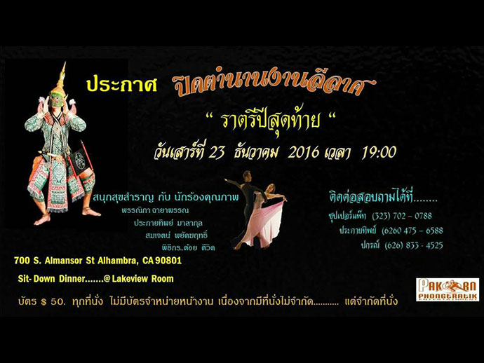 มูลนิธิแพทย์อาสาสมเด็จพระศรีนครินทราบรมราชชนนี ร่วมสนุกร้องเพลง, เต้นรำ รับประทานอาหาร พร้อมลุ้นโชครางวัลราฟเฟิล ในวันเสาร์ที่ 15 ตุลาคม 2016 *แต่งกายไทยย้อนยุค/สุภาพ งานเริ่ม 6pm. Buffet Dinner 7pm. ที่ Arcadia Community Center 365 Campus Dr., Arcadia, CA 91066 บัตรราคา VIP $40, 35 ซื้อบัตรหรือสอบถามได้ที่ 818-681-3653, 818-903-8400 และ 626-345-8706……..* วันเสาร์ที่ 15 ตุลาคม 2016 เตรียมพบกับ