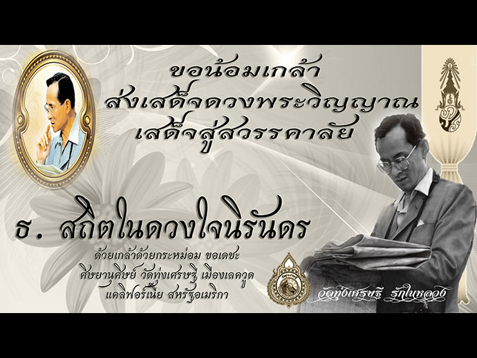 เสด็จสู่สวรรคาลัย ธ.สถิตในดวงใจนิรันดร์ ณ วัดทุ่งเศรษฐี เมืองเลควูด Address: 11911 207th Street, Lakewood, CA 90715 เป็นเวลา 1 เดือน เริ่มวันศุกร์ที่ 14 ตุลาคม 2559 เป็นต้นไป สอบถามรายละเอียดได้ที่ (562) 865 - 1716 (562) 382 – 3767……..*
