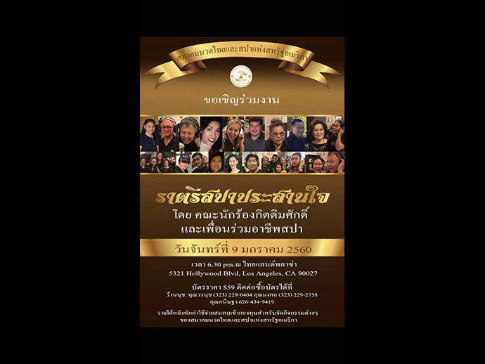 พระบาทสมเด็จพระปรมินทรมหาภูมิพลอดุลยเดช โดยปีนี้ผู้จัดจะมอบเสื้อยืดเป็นของขวัญปีใหม่ให้กับทุกท่านที่เข้าร่วมงานท่านละ 1 ตัว แต่งตัวตามความเหมาะสม ไม่มีบัตรจำหน่ายหน้างาน ท่านที่จองบัตรไว้แล้ว กรุณาสั่งอาหารไว้ล่วงหน้ามีให้เลือก เนื้อ กับ ไก่ สนใจเข้าร่วมงานติดต่อซื้อบัตรได้ที่ “ปกรณ์” 626-833-4525,