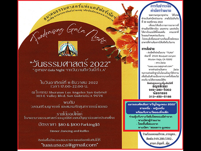 วันธรรมศาสตร์ 2022 วันอาทิตย์ที่ 22 ธันวาคม 2022 เวลา 17:00 น. ติดต่อสอบถามเพิ่มเติมได้ที่ อัญชลี 949-280-5302
