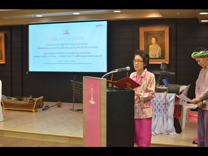 คณะครูทุกคนที่ผ่านการอบรมตามหลักสูตรของศูนย์ฯ จะได้รับเกียรติบัตรของศูนย์ส่งเสริมการสอนภาษาไทยและวัฒนธรรมไทย คณะครุศาสตร์ จุฬาลงกรณ์มหาวิทยาลัย สถานที่อบรมคือคณะครุศาสตร์ และโรงเรียนสาธิตจุฬาลงกรณ์มหาวิทยาลัย ศ.ประภาศรี สีหอำไพ เป็นประธานพิธีมอบเกียรติบัตรการอบรมครู เมื่อวันที่ 5 เมษายน 2556 สำหรับภาคธรรมปฏิบัติ พระครูวรกิตติโสภน และศาสตราจารย์กิตติคุณอำไพ สุจริตกุลเป็นประธานและฝึกอบรมที่วัดนาคปรก