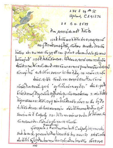 เราดีใจกันมากที่ได้รับข่าวจากอาจารย์และรู้สึกเหมือนอยู่ใกล้ๆ กันนี่เอง ความจริงไกลกันไม่น้อย ประจวบเหมาะกับบุญศรีและสุรภินจะเดินทางไปประชุมหมอในวันพรุ่งนี้ เราก็ดีใจที่ทั้งสองคนจะได้ไปพบอาจารย์แทนเราทั้งบ้าน ดิฉันปรารถนาให้เขาทั้งสองมีเวลาทันพาอาจารย์ดูมหาวิทยาลัยเบิร์กเลย์ ถ้าเราอยู่ใกล้ คงจะได้พาอาจารย์ไปเที่ยวที่อื่นๆ และมาบ้านเราบ้าง