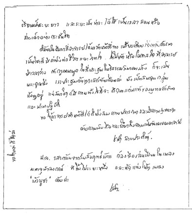 ลายมือของคุณชนิต สายประดิษฐ์ มี 2 แผ่น ดังการถอดความลงพิมพ์ในคอลัมน์ สารพันวรรณนา หนังสือพิมพ์ไทยแอล.เอ. ผู้เขียนคอลัมน์ เขียนตามเพื่อชัดเจนจากฉบับถ่ายเอกสารไว้ ส่วนฉบับจริงรักษาไว้ตามต้นฉบับ