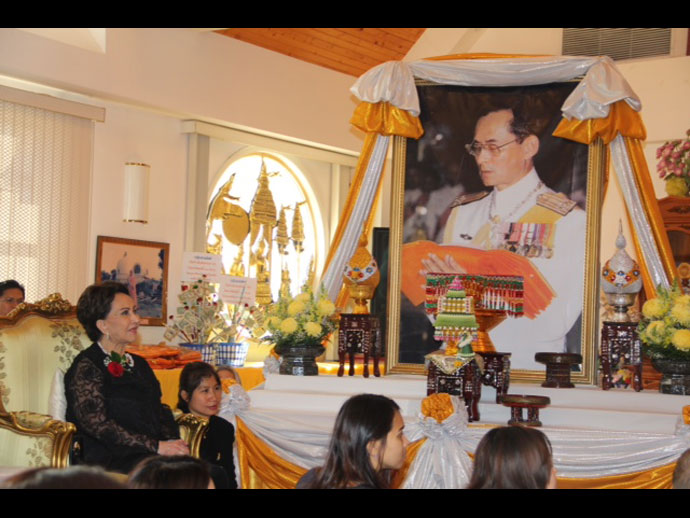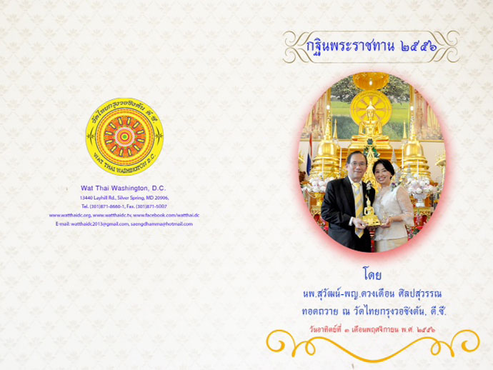 นอกจากนี้ท่านย้ำนโยบายใหม่ของรัฐบาลปัจจุบันว่า เน้น “การทูตเพื่อประชาชน” อดีตอาจจะมุ่งการเมือง การทหาร การเศรษฐกิจ สถานทูตพร้อมจะ “รับใช้” มีสิ่งใดมีปัญหามาแจ้งได้ “ปรึกษาที่ผมและเพื่อนข้าราชการ” ขณะนี้เปิดบริการทำบัตรประชาชนที่ชำรุดเสียหายไปสถานทูตได้ แต่ถ้าทำบัตรครั้งแรกต้องส่งเข้ากรุงเทพฯ สำหรับสถานกงสุลไทยได้ย้ายจากยอร์ชทาวน์ กลับไปอยู่ที่เดิมแล้ว อนึ่งในวันที่ 4 ธันวาคม สถานทูตจะจัดงานเฉลิมพระชนมพรรษาของพระบาทสมเด็จพระเจ้าอยู่หัว ขอเชิญไปร่วมกันถวายพระพร ประธานเจ้าภาพใหญ่ของพิธีการถวายผ้าพระกฐิน นายแพทย์สุวัฒน์ ศิลปสุวรรณ กล่าวคำปราศรัยสุดท้ายเรียกเสียงหัวเราะ อิ่มใจ อิ่มบุญ จำได้สั้นๆ แต่สร้างวิสัยทัศน์เด่นชัดว่าการทำบุญทำกุศลนั้น เจ้าภาพผู้เป็นที่รักของสาธุชนสรุปว่า “ทำบุญได้ชาติหน้า – เสนอหน้าได้ชาตินี้” เรียกเสียงหัวเราะได้ขณะในพระอุโบสถประดิษฐานพระพุทธมงคลวิมลดี.ซี. วิจิตรศิลป์เรืองรองสีทองส่องประกายแจ่มจ้าจับใจทุกคนในชุมชนไทย ที่วันนี้หน้าวัดไทยรถจอดยาวเป็นกิโลเมตร รวมทั้งหลังวัดด้วย นี่แหละคืออิ่มบุญ อุ่นใจ มาทำบุญ “เสนอหน้า ได้ชาตินี้” จริงๆ ปีหน้าประกาศเจ้าภาพประธานกฐิน ประจำปี 2557คุณสุริยันต์ สกอร์เซด นายกสมาคมกอล์ฟไทย กรุงวอชิงตัน,ดี.ซี. (คุณรัตนา สกอร์เซด ภริยา) เจ้าของร้านไทยไททานิค