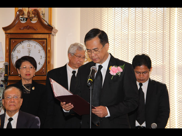 จบพิธีถวายผ้าพระกฐินพระราชทานแล้ว เอกอัครราชทูต ดร.วิชาวัฒน์ อิศรภักดี กล่าวปราศรัยโดยเริ่มอย่างเป็นทางการในตอนแรก แล้วกล่าวข้อความต่อไปโดยไม่อ่านจากเอกสารคำกล่าว ดูเป็นกันเอง เริ่มตั้งแต่ได้มาเป็นประธานเปิดห้องสมุด “หลวงตาชี” ท่านเล่าว่าเมื่อ 20 ปีก่อนได้เคยมาประจำอยู่ที่กรุงวอชิงตันดี.ซี. รู้สึกเป็นเกียรติที่ได้มาประจำอยู่ในประเทศที่มีความสัมพันธ์เก่าแก่ที่สุดในสนธิสัญญายาวนานกับไทย ชุมชนไทยที่นี่เข้มแข็งมีคนไทยมาก ดีใจที่ได้มากราบหลวงตาชีอีก ท่านเป็นพระผู้ใหญ่ เป็นที่เคารพยิ่งของชุมชนไทย ดีใจที่ได้ทำงานร่วมกันอีก สมัยก่อนมางานสงกรานต์ คนมาวัดมาก รู้สึกภูมิใจและขออนุโมทนาที่ร่วมใจกันสมทบทุนสร้างอาคารหลวงตาชีสำเร็จ