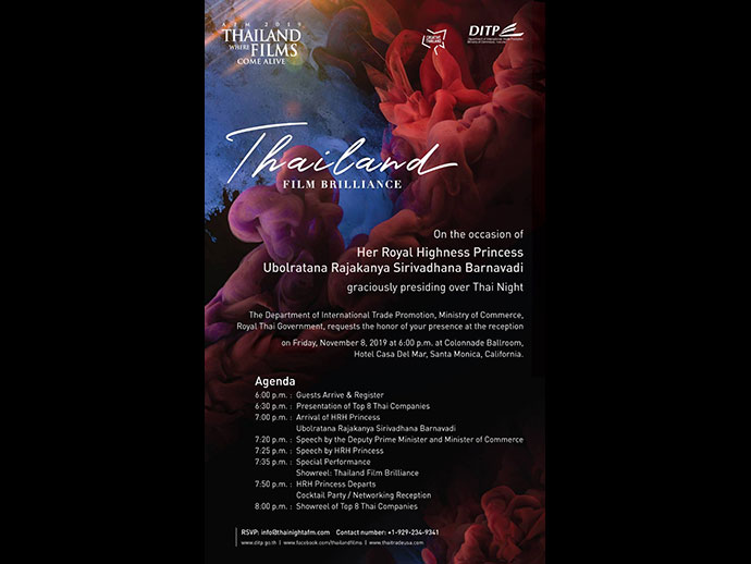 ภาพบรรยากาศงาน Thai Night at American Film Market 2019 เมื่อวันศุกร์ที่ 8 พฤศจิกายน พ.ศ. 2562 ณ Colonnade Ballroom โรงแรม Hotel Casa Del Mar เมืองซานตามอนิก้า รัฐแคลิฟอร์เนีย จัดโดยกรมส่งเสริมการค้าระหว่างประเทศ กระทรวงพาณิชย์แห่งประเทศไทย และมีทูลกระหม่อมหญิงอุบลรัตนราชกัญญา สิริวัฒนาพรรณวดี มาเป็นองค์ประธานในงาน…(เครดิตภาพ/ข่าว:วลัยพรรณ เกษทอง)