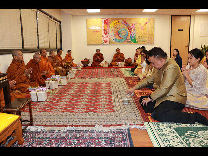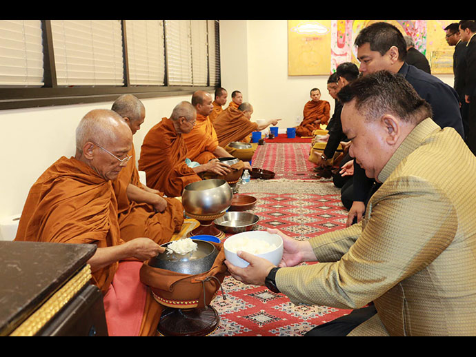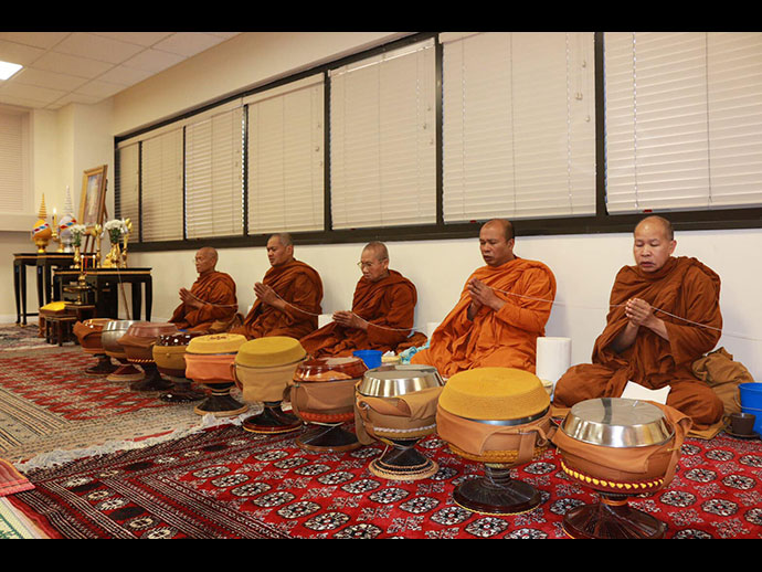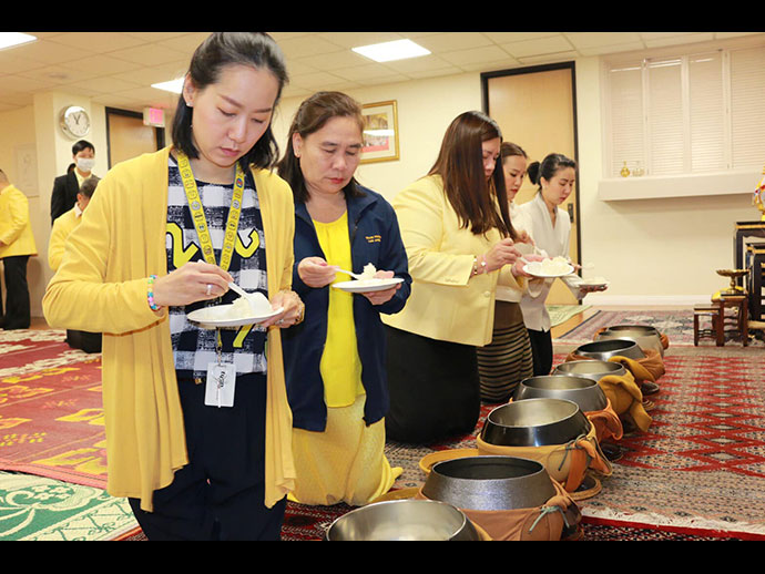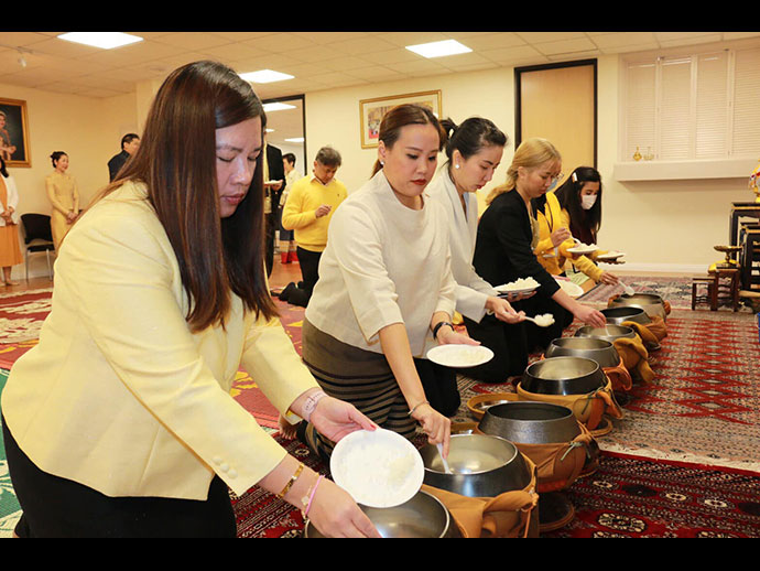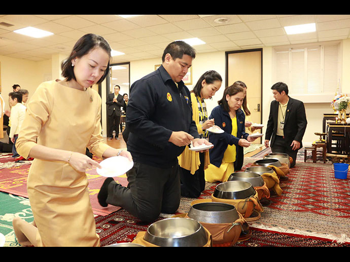 ในเวลา 9.00 - 12.00 น. กงสุลใหญ่ฯ ได้เป็นประธานในพิธีทำบุญตักบาตรและถวายเพลพระสงฆ์ โดยได้จุดธูปเทียนเครื่องนมัสการบูชาพระรัตนตรัยและเครื่องทองน้อย ถวายราชสักการะเบื้องหน้าพระบรมฉายาลักษณ์ จากนั้นพระสงฆ์จำนวน 10 รูป เจริญพระพุทธมนต์ถวายพระพรชัยมงคล และแสดงอนุโมทนากถา ถวายเป็นพระราชกุศล เสร็จแล้วผู้เข้าร่วมพิธีฯ ถวายเพลแด่พระสงฆ์ร่วมกัน