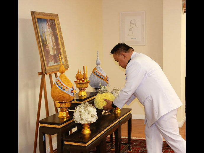 ต่อมาในเวลา 14.00 - 15.00 น. กงสุลใหญ่ฯ เป็นประธานในพิธีถวายพานพุ่มดอกไม้ถวายราชสักการะ เริ่มโดยผู้เข้าร่วมพิธีถวายความเคารพเบื้องหน้าพระบรมฉายาลักษณ์ พระบาทสมเด็จพระบรมชนกาธิเบศร มหาภูมิพลอดุลยเดชมหาราช บรมนาถบพิตร จากนั้นกงสุลใหญ่ฯ ได้เป็นผู้แทนข้าราชการ เจ้าหน้าที่ และเหล่าผสกนิกรชาวไทยที่อยู่อาศัยใน 13 รัฐทางตะวันตกของสหรัฐฯ ถวายพานพุ่มดอกไม้เพื่อเป็นราชสักการะ และนำกล่าวถวายราชสดุดีน้อมรำลึกในพระมหากรุณาธิคุณและพระราชกรณียกิจที่ได้ทรงปฏิบัติเพื่อประชาชนไทยตลอดระยะเวลา 70 ปีที่ทรงครองราชย์