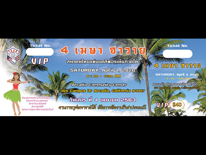 อนึ่งฝากประชาสัมพันธ์งานต่อไป ทางสมาคมไทยฯ จะมีกำหนดจัดงาน “ 4 เมษา ฮาวาย ” วันเสาร์ ที่ 4 เดือนเมษายน 2563 ที่ Arcadia community center เป็นงานการกุศลหารายได้ เพื่อการจัดงานกีฬาประเพณี จึงขอเชิญชวนทุกท่านสนับสนุนกิจกรรมเพื่อการพัฒนาชุมชนไทยไปด้วยกันต่อไป.