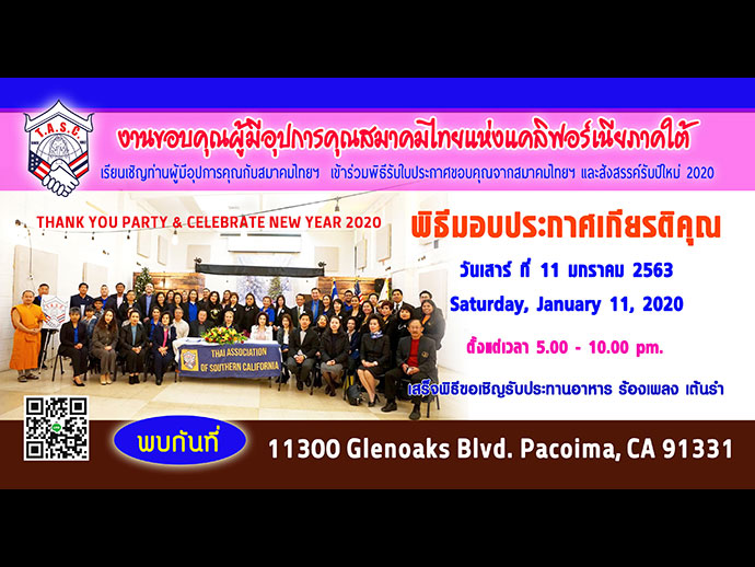 เมื่อวันเสาร์ ที่ 11 มกราคม 2563 ที่ผ่านมา ตั้งแต่เวลา 5:00 p.m. คุณกนิษฐา เพอร์ไรดา นายกสมาคมไทยแห่งแคลิฟอร์เนียภาคใต้ นำทีมสมาคมไทยฯ จัดงาน “ THANK YOU PARTY & CELEBRATE NEW YEAR 2020” ณ Alicia Broadous-Duncan Multi-Purpose Senior Center Pacoima, CA 91331 โดยมี ท่านมังกร ประทุมแก้ว กงสุลใหญ่ นครลอสแอนเจลิส ได้ให้เกียรติมาเป็นประธานมอบใบประกาศเกียรติคุณแด่ผู้มีอุปการะคุณต่อสมาคมไทยฯ ในตลอดหนึ่งปีที่ผ่านมา