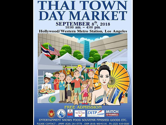 • “Thai Town Day Market” ณ Hollywood/Western Metro Station เมื่อวันที่ 8 กันยายน 2561 โดยภายในงาน มีคนไทยมาร่วมออกบูธขายสินค้าไทย มีการแสดงศิลปวัฒนธรรมไทย อาทิ ดนตรีไทย การรำไทย รวมทั้งมีการแข่งขันตำส้มตำซึ่งเป็นอาหารขึ้นชื่อของคนไทย เป็นต้น