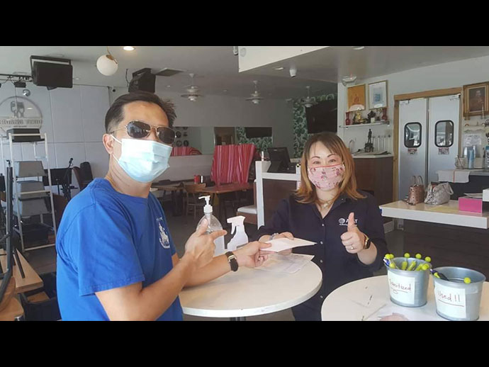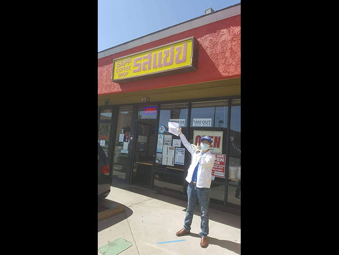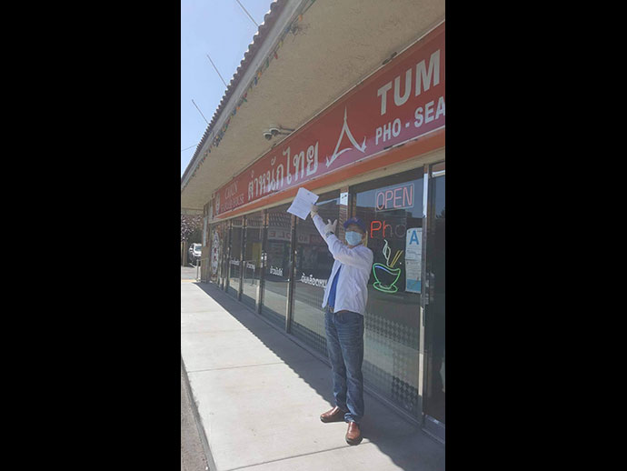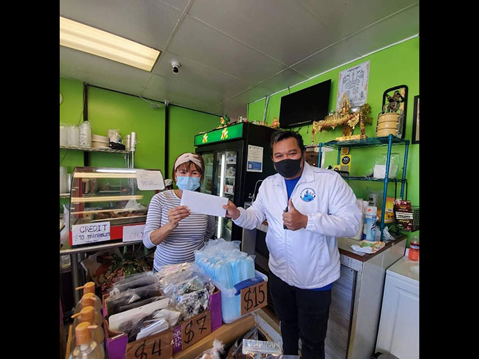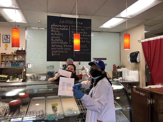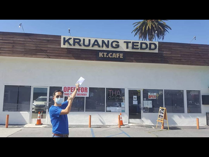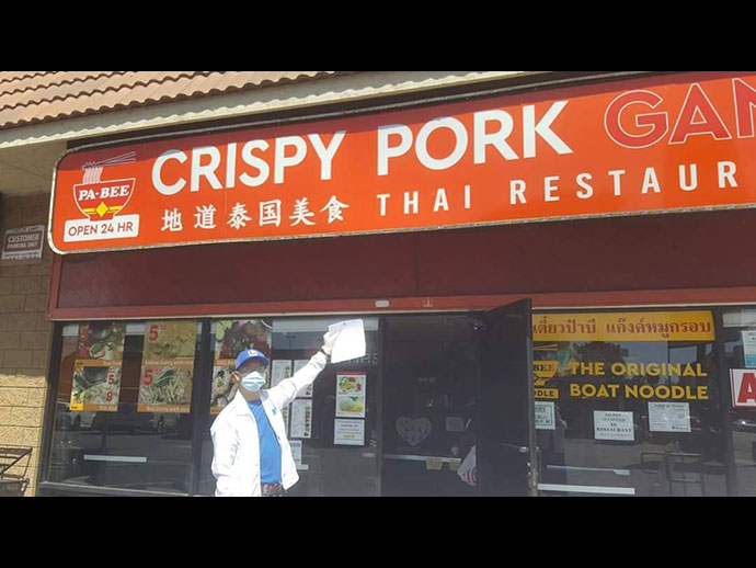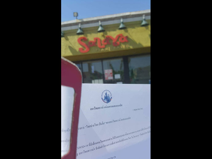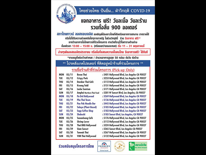 โดยโครงการนี้ คุณตัน พัฒนะ นายกสภาไทยทาวน์ฯ และทีมงานบริหารฯ ได้เชิญชวนร้านค้าในเขตไทยทาวน์ เข้าร่วมรายการทั้งหมด 18 ร้านค้า เพื่อแจกจ่ายอาหารให้กับพี่น้องคนไทย วันละ 50 ออเดอร์ (รายละเอียดวันและร้านที่แจกอาหารโปรดดูตามโปสเตอร์)