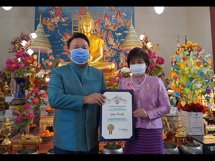 คณะสงฆ์วัดไทยลอสแองเจลิส โดยหลวงพ่อใหญ่ ท่านเจ้าคุณพระเทพมงคลวิเทศ ขออนุโมทนาบุญขอบคุณท่านกงสุลใหญ่ ณ นครลอสแองเจลิส คุณมังกร ประทุมแก้ว ที่ให้เกียรติเป็นประธานในพิธีเปิดงานเทศกาลประเพณีสงกรานต์วันขึ้นปีใหม่ไทย ของวัดไทยฯ ขออนุโมทนาบุญขอบคุณท่านประธานจัดงาน คุณตัน พัฒนะ นายกสภาไทยทาวน์ คุณจีน่า ปรีชา และรองประธานจัดงาน ที่เสียสละ ทุ่มเทอุทิศแรงกายแรงใจอย่างไม่เห็นแก่เหนื่อยยาก ช่วยกันเตรียมงาน และจัดการให้งานประสบความสำเร็จเกินคาดหมาย ขออนุโมทนาบุญญาติโยมทุกท่าน ที่ไปร่วมงานร่วมกันเสริมสร้างบรรยากาศแบบไทยๆ อันงดงามให้ปรากฏในต่างแดน