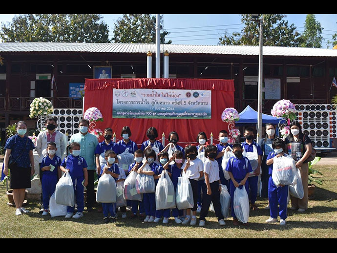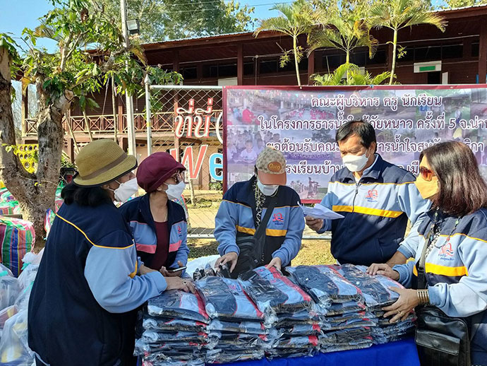 โดยมี นายวิศิษย์ ทวีสิงห์ ปลัดจังหวัดน่าน เป็นประธานเปิดกิจกรรม มูลนิธิฯ มอบผ้าห่ม ชุดวอร์ม อุปกรณ์กีฬา และเลี้ยงอาหารกลางวัน ตามโครงการธารน้ำใจสู้ภัยหนาว ครั่งที่ 5 มามอบให้ให้แก่เด็กนักเรียน จํานวน 13 โรงเรียน ในพื้นที่ 4 อําเภอ ได้แก่ อําเภอเมืองน่าน อําเภอภูเพียง อําเภอเวียงสา และอําเภอ ทุ่งช้าง ซึ่งได้แยกออก ตามจุดเป้าหมาย เป็น 9 โรงเรียน 9 ศูนย์พัฒนาเด็กเล็ก รวม 900 คน เพื่อให้การช่วยเหลือเด็กยากจนหรือเด็กด้อยโอกาส และให้การสนับสนุนทางด้านการศึกษา ในโครงการธารน้ำใจสู้ภัยหนาว ที่ทางมูลนิธิฯ ได้จัดทำโครงการนี้มาแล้ว 4 ครั้ง ตั้งแต่ปี 2555 เป็นต้นมา