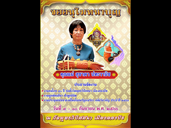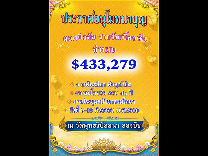 ขออนุโมทนาบุญกับประธานจัดงาน คุณแม่สุชาดา ปทะวานิช ท่านกงสุลใหญ่ ณ นครลอส แอบเจลิส ต่อ ศรลัมพ์ และภริยา ประธานในพิธีฝ่าย ฆราวาส คณะญาติโยมทุกๆท่าน อุบาสก อุบาสิกา วัดพุทธวิปัสสนา ลองบีช ยอดปัจจัยทำบุญเบื้องต้น $433,279