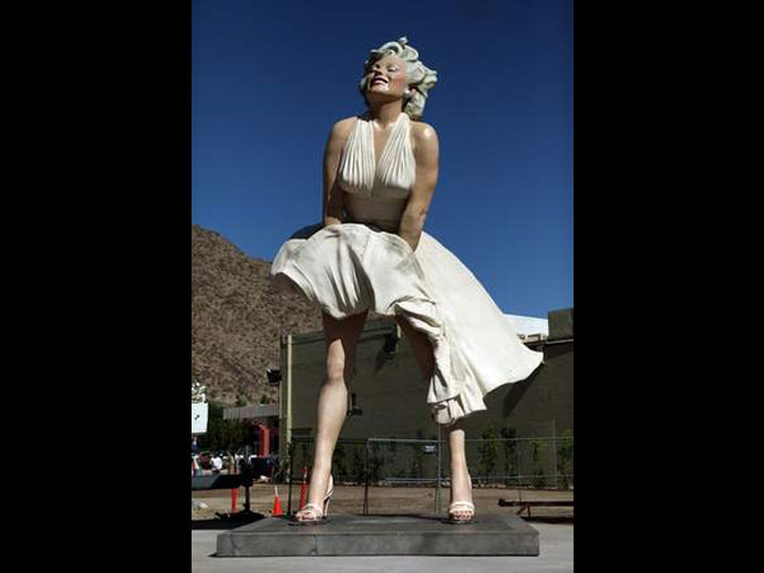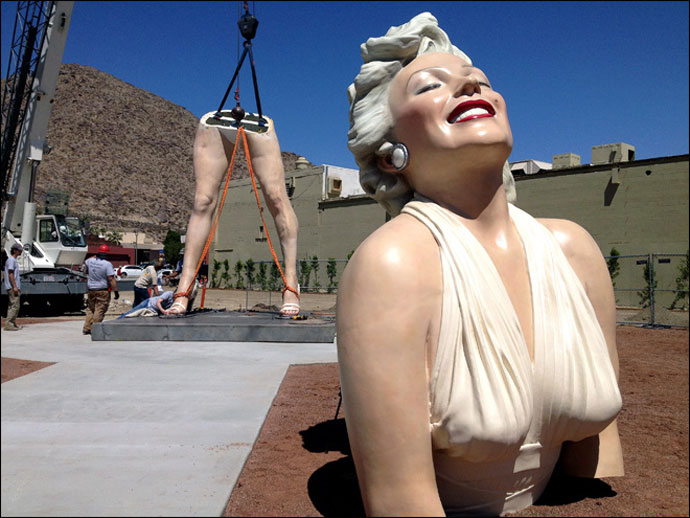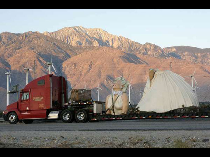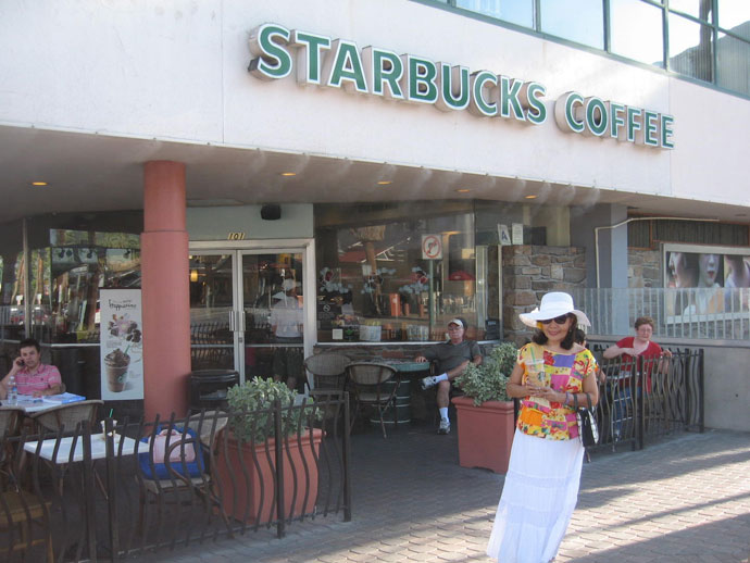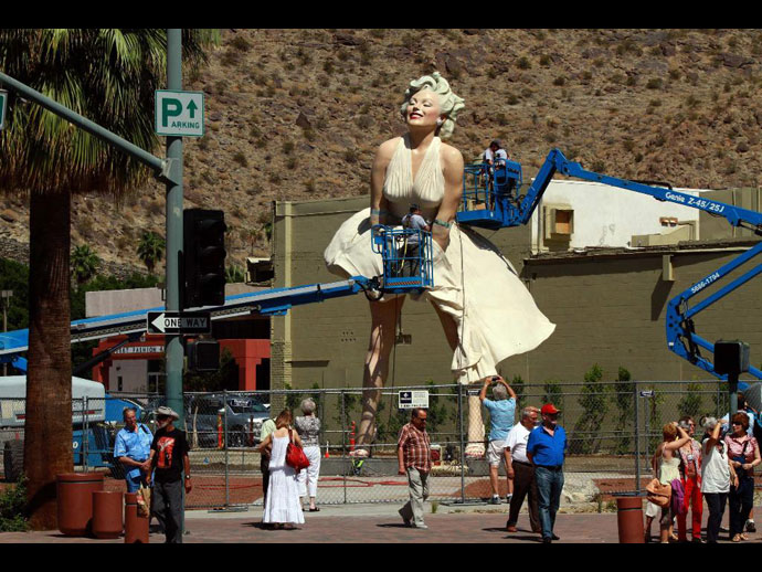 ถ้าจะไปดูความใหญ่โตของมาริลิน ใหญ่โตจริงๆ เพราะสูงถึง 26 ฟุต และหนัก 34,300 ปอนด์ ขนาดแยกเป็นชิ้นๆ ยังต้องใช้เครื่องมือแบบทุ่นแรงช่วยยก หาง่ายมากพอเข้าเขต P.S. ก็ขับรถเรื่อยมาบน Highway 111- ถนน PALM CANYON DR. จนถึงบริเวณดาวน์ทาวน์อยู่ทางขวามือ ตอนนี้อากาศเริ่มจะร้อนขึ้นๆ เข้าไปทุกทีตอนที่ ส.ท่าเกษม ไปพักผ่อนที่นั่น กำลังสบายเป็นเดือนพฤษภาคม แต่ตอนอยู่กลางแจ้งถ่ายรูปก็ร้อนเหมือนกัน พอดีข้ามถนนไปก็เป็นร้านกาแฟชื่อดัง มีไอน้ำพ่นให้ความชุ่มชื่น กาแฟเย็น กลิ่นหอมชื่นใจ รสหวานมันเพราะครีมและน้ำตาล ร้านนี้เลยโชคดีไป เชื่อว่าคงได้ลูกค้าเพิ่มเพราะทาง FOREVER MARILYN จะมีงานฉลองกันอยู่เรื่อยเพื่อดึงดูดนักท่องเที่ยวทั่วโลก
