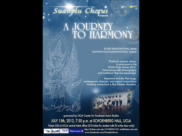 หลังจากเสร็จการแข่งขัน อ.ดุษฎี (ครูดุษ ของลูกศิษย์) หรือ "พี่ดุษ" ของ ส.ท่าเกษมจะนำคณะนักร้องฯ มาเยี่ยมเยียนชาวไทยที่เมืองนางฟ้า นครลอสแอนเจลิสในธีม "A JOURNEY TO HARMONY" มีชุด "มโนราห์" เป็นไฮไลท์ เพียงแต่ได้ยินชื่อ "มโนราห์" ก็เป็นหลักประกันความเพลินตาเพลินใจเสียแล้ว โดยเฉพาะแสดงโดย คณะนักร้องประสานเสียงสวนพลู ที่มีความสามารถสูง อย่าได้พลาดเชียว ! เป็นทั้งอาหารตา อาหารใจ และทางโสตให้รื่นหูอีกด้วย