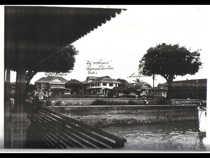 รูปที่ #8 ที่นำมาลงเพื่อให้คุณผู้อ่านได้เห็นภาพ เป็นบริเวณส่วนหนึ่งของบ้านท่าเกษมพวกเราพี่ ๆ น้อง ๆ ผู้หญิงชอบเดินเล่นเป็นกลุ่ม รอบบ้านหลังอาหารค่ำ ทางด้านซ้ายตรงมุมระหว่างเสา 2 ต้นของเรือนมัจฉาสุวรรณ จะเห็นเรือนญาณวารีหรือเรือนเขียวนิดหนึ่ง ส.ท่าเกษมเคยเขียนถึง "เรือนเขียว" มาแล้ว เป็นเรือนไม้ 2 ชั้น ทาสีเขียว มีสนามหญ้าเขียวขจีและแปลงดอกไม้หลากสีหลากชนิดหน้าเรือน คุณพ่อหลวงหรือหลวงสุขุมนัยประดิษฐ์ เป็นเจ้าของเรือนหลังนี้ ท่านอยู่กับภรรยาคุณรัตนา และบุตร-ธิดา พี่สุมน พี่ประเดิม และพี่จิ๋ว (สำเนา สุขุม) เท่าที่ทราบคุณเกียรติเป็นเพื่อนของพี่จิ๋ว พอได้ยินผู้ใหญ่เอ่ยว่าคุณเกียรติมา พวกเราจะเดินผ่านเรือนเขียวเพื่อแอบดูคุณเกียรติ ซึ่งสำหรับพวกเราแล้วเป็นผู้ใหญ่คนหนึ่ง เพราะพี่จิ๋วเป็นรุ่นพี่
