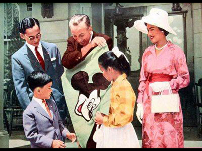 พระบาทสมเด็จพระเจ้าอยู่หัวฯ และ สมเด็จพระบรมราชินีนาถ เสด็จเยือนประเทศสหรัฐอเมริการะหว่าง มิถุนายน – กรกฎาคม พ.ศ. ๒๕๐๓ นอกจากเสด็จฯ ทอดพระเนตรการถ่ายทำหนังเรื่อง G.I.BLUES ที่โรงถ่ายทำภาพยนตร์พาราเม้าท์ แสดงนำโดย เอลวิส เพรสลี่ย์ (Elvis Presley) และ จูเลียท เพราส (JULIET PROWSE) แล้ว ยังได้เสด็จพระราชดำเนินไปยัง DISNEYLAND ในวันที่ ๒๒ มิถุนายนปีเดียวกันนั้น ครั้งนี้มีสมเด็จเจ้าฟ้าชายวชิราลงกรณ์ และ สมเด็จเจ้าฟ้าหญิงอุบลรัตน์ ตามเสด็จ มีนายวอลท์ ดิสนี่ย์ ถวายการต้อนรับอย่างใกล้ชิด