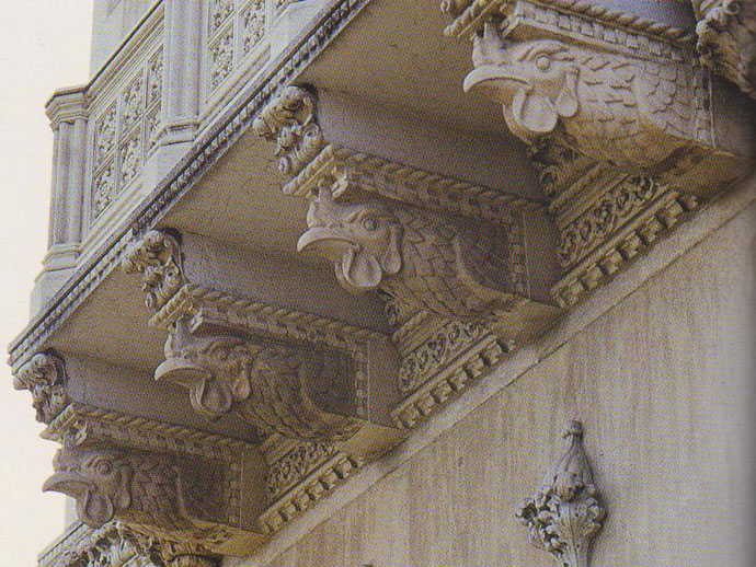 มีข้อที่น่าสังเกตอยู่ข้อหนึ่งเกี่ยวกับสิ่งตกแต่งภายนอกรอบตึก กล่าวคือ เมื่อเดินดูรอบๆ แล้วจะเห็นสิ่งหนึ่งคือ ปูนปั้นเป็นรูป “หัวไก่” แค่คอบ้าง ครึ่งตัวบ้างประดับอยู่ตามใต้กรอบหน้าต่างเหมือนกับเป็นเครื่องหนุนคานหน้าต่างทุกบาน และตามปลายรางน้ำที่ระบายน้ำฝนจากหลังคาสู่พื้นชั้นล่างทุกราง แม้ปลายคานรับระเบียงก็ประดับด้วยหัวไก่ เช่นเดียวกัน เรื่องนี้มีบางท่านให้ความเห็นว่า จอมพล ป. พิบูลสงคราม สั่งให้ทำเป็นหัวไก่เมื่อมีการปรับปรุงตึกไทยคู่ฟ้า เพราะท่านเกิดปีระกา แต่มีหลายท่านซึ่งเคยอาศัยอยู่ในบริเวณบ้านนรสิงห์ยืนยันว่า เดิมก็เป็นรูปหัวไก่ไม่ใช่ของทำใหม่ เพราะคุณหญิงประจวบฯ ภริยาของท่านเจ้าของบ้านเกิดปีระกา
