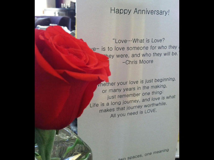 พอนั่งโต๊ะเสร็จเรียบร้อย นอกจากกุหลาบแดงยังมีแผ่นกระดาษคุณภาพดีบรรจุกลอนแห่งความรักสำหรับวันฉลองครบรอบสมรส ช่วงหลังรายการจิบน้ำชาพร้อมของว่าง พนักงานเสิร์ฟได้นำ CHOCOLATE MOUSSE ประดับประดาน่ารักกระจุ๋มกระจิ๋มปักเทียนสีชมพูเขียนคำว่า “CONGRATULATIONS” บนจานกระเบื้องสีขาวรูปรียาวมาให้