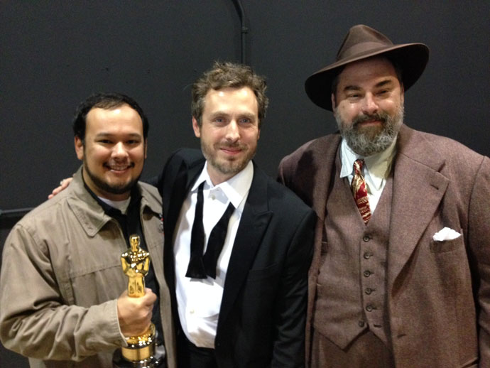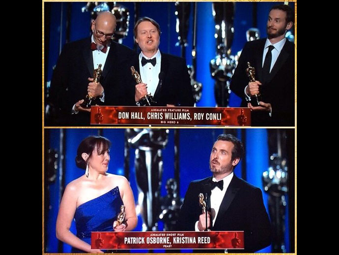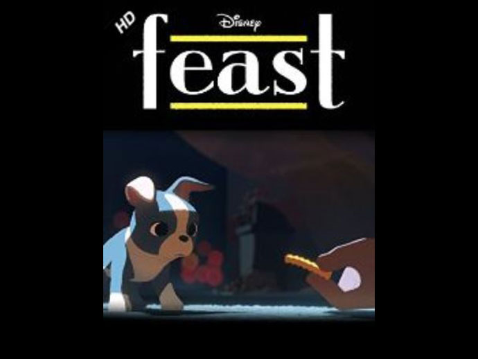 ส่วนหนัง ANIMATION ที่เรียกกันง่ายๆว่าหนังการ์ตูนได้สร้างประวัติศาสตร์ที่สตูดิโอเดียวได้รับทั้ง ๒ รางวัลคือ BEST ANIMATED FILM และ BEST ANIMATED SHORT FILM ที่จะคุยถึงในคอลัมน์นี้ชื่อ FEAST คงจะหมายถึงการกินเลี้ยง เห็นรูปโฆษณามีเจ้าสุนัขพันธุ์ BOSTON TERRIER ชื่อ WINSTON นั่งโต๊ะอยู่ตัวเดียว มีอาหารนานาชนิดบนโต๊ะซ้อนเรียงรายกันขึ้นไปสูงมาก สหรัฐถูกเรียกตัวเข้าไปร่วมทีมกับ FEAST ฐานะ STORY ARTIST และพอดีมีสุนัขพันธุ์นี้อยู่ ๒ ตัว เลยพาไปให้ทีมงาน ศึกษาการกินอาหาร การเคลื่อนไหว ฯลฯ ในสตูดิโอ ปรากฎว่าผู้คนจากแผนกอื่นๆ เข้ามาเล่นกับเจ้า SWEET PEA และ CHIBI สนุกกันใหญ่