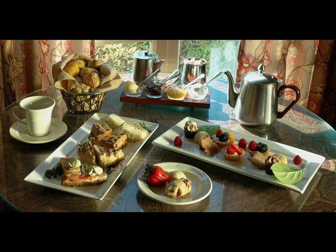 ที่เขาเรียก ROSE GARDEN-TEA ROOM เพราะจากที่เรานั่งจิบน้ำชานั้นระหว่างปลายเดือนมีนาคมและต้นเดือนเมษายน เป็นเวลาที่ดอกกุหลาบบานสพรั่งสวยที่สุดในรอบปี มองไปรอบๆ จะเห็นกุหลาบเต็มสวน ๓ เอเค่อร์ ตอนที่พวกเรา ๔ คนไปรับประทานน้ำชาใน”วันแห่งความรัก” นั้น กอกุหลาบถูกริดรอนกิ่งก้านเพื่อให้ได้กุหลาบดอกใหญ่ที่ทนและมีคุณภาพเตรียมต้อนรับ “คนรักกุหลาบ” ในต้นเดือนหน้านี้ ขอเตือนว่าควรให้เวลาตัวเอง ๓๐นาทีก่อนเวลาจองที่ เพราะระยะเวลาที่เดินจากสถานที่จอดรถไปยังตึกห้องน้ำชาไกลพอควร ของว่างหัวใจของการดื่มน้ำชาตอนบ่ายที่ขาดไม่ได้ดังที่เห็นในรูป มีกาและถ้วยน้ำชา ในถาดยาวบรรจุ เนยเหลว แยมผลไม้ (Jam ออกเสียง แจม) แยมผิวส้ม และ CLOTTED CREAM รับประทานกับสโคนที่เพิ่งทำออกมาจากเตาอบร้อนๆ ส่วนแซนวิช ผลไม้ ขนม เนยแข็ง จะแตกต่างกันไปตามห้องน้ำชาแต่ละแห่ง ไปมาแล้วหลายแห่ง “TEA ROOM” ในเมือง MONTROSE, “ROSE TREE COTTAGE TEA” เมือง PASADENA, RITZ CARTON ที่ DANA POINT, FOUR SEASONS ที่ CARLSBAD ทุกสถานที่ต่างมีเสน่ห์ของตัวเอง แต่ถ้าให้เลือกคงไปนั่งจิบน้ำชาแถวทะเลเพราะความผูกพันกับทะเลที่บ้าน “เกษียรสมุทร” จังหวัดประจวบคีรีขันธ์ ยามปิดเทอมในฤดูร้อนของทุกปี บิดาและครอบครัวของท่านจะร่วมจิบน้ำชารับประทานของว่างที่บ้าน “เกษียรสมุทร” ริมหาดอ่าวไทยด้วยความรักและความอบอุ่น!