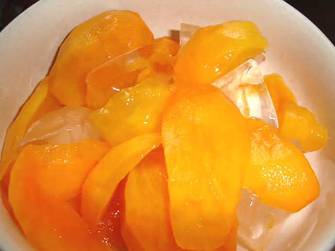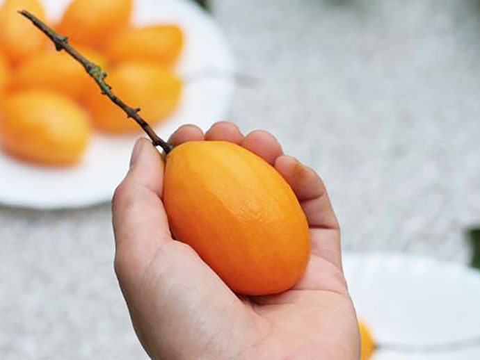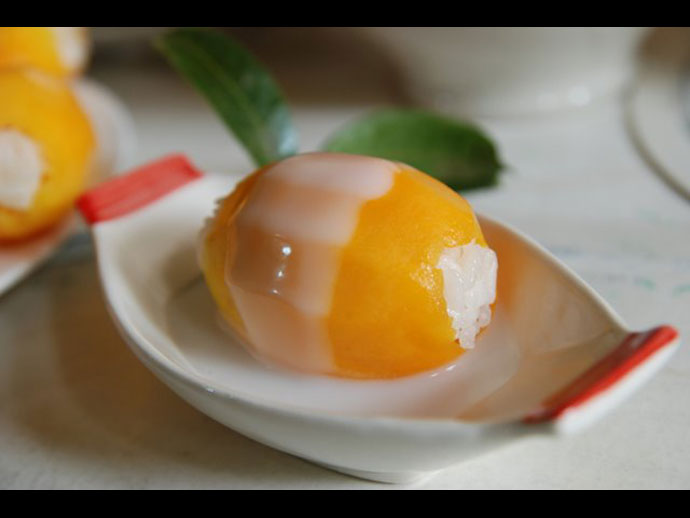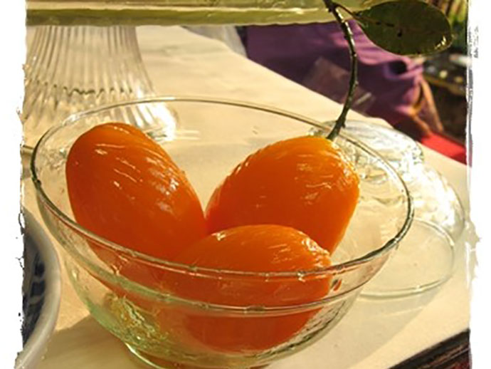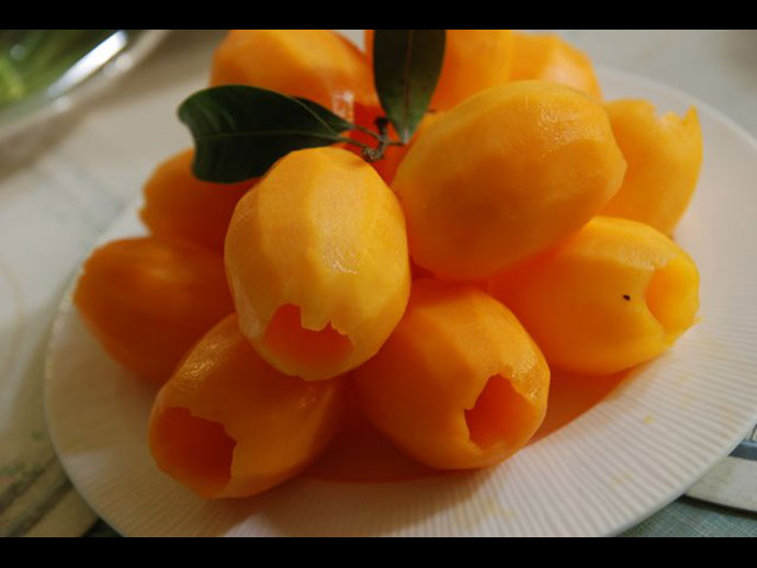 ๔. ล้างแล้วคลุมด้วยผ้าขาวบางชุบน้ำเพื่อกันไม่ให้ผลมะปรางแห้ง เมื่อได้มะปรางตามจำนวนที่ต้องการ นำไปชุบน้ำเชื่อมเข้มข้นเพื่อให้เห็นริ้วชัดสวย และจัดเรียงในโถแก้วประดับดอกมะลิหอมกรุ่น