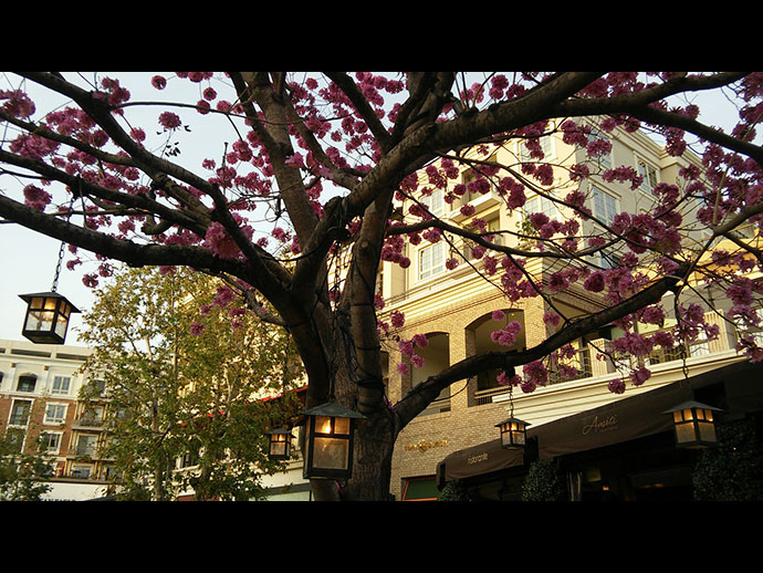 ขอแนะนำให้จอดรถที่ GLENDALE GALLERIA แล้วเดินทะลุผ่านร้านรวงต่างๆ ออกจากตัวตึก เดินข้ามถนนไปยัง AMERICANA, เป็น SHOPPING MALL กลางแจ้ง นอกจากมีร้านอาหาร โรงภาพยนตร์ ร้านสินค้า ยังมีสนามหญ้ากว้างขวางเขียวขจีอยู่ตรงกลาง ได้ยินเสียงเพลงไพเราะดังมาจากลำโพงที่ติดตั้งไว้รอบบริเวณ จากนักร้องรุ่นเก่าเช่น แฟรงค์ ซินาทร้า อยากเดิน อยากนั่งรถรางผ่านรอบๆ ร้านรวง หรือนั่งพักที่สนามหญ้า ดูน้ำพุ ฟังเพลงได้ทั้งนั้น ภาพแรกถ่ายที่ AMERICANA ใช้มือถือแอนดรอยด์เก็บภาพเช่นกัน จากการที่ชื่นชมสะดุดตากับดอกไม้สีชมพูเต็มต้น!