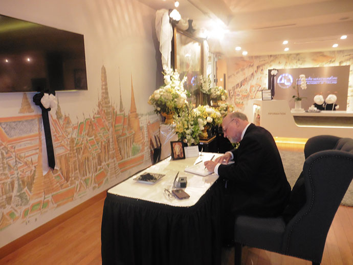 หมายเหตุ ช่วงเวลาที่เขียนลงให้สาธารณะชนลงนามถวายอาลัยนั้น ได้โทรศัพท์ไปถามที่สถานกงสุลใหญ่วันนี้ (พุธที่ ๑๖ พ.ย.) ได้รับคำตอบซึ่งต่างไปจากสื่ออื่นที่แจ้งว่าเปิด ๙.๐๐น.ถึง ๑๗.๐๐ น. ทางที่ดีสืบถามให้แน่นอนก่อนไป !