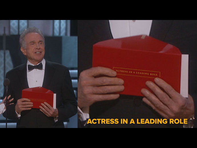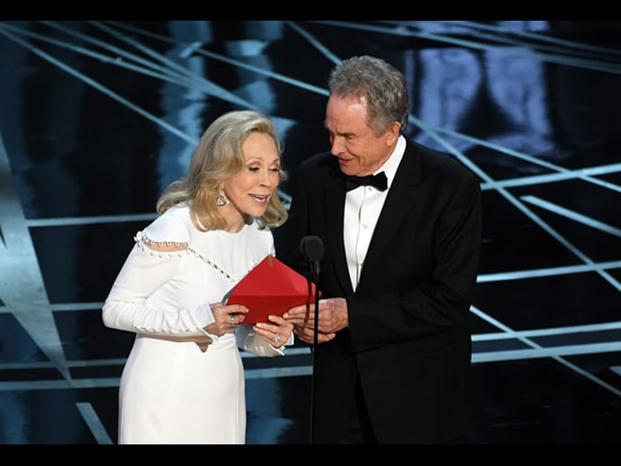 เรื่องที่เป็นข่าวใหญ่อยู่จนถึงทุกวันนี้ โดยเฉพาะสถานีโทรทัศน์ทุกช่องทุกรายการ จะพูดถึงความผิดพลาดอย่างไม่น่าจะเกิดขื้น เหตุเพราะความเลิ่นเล่อประมาทไม่เอาใจใส่กับหน้าที่สำคัญที่ตัวรับผิดชอบอยู่ รายการสุดท้ายที่ทุกคนรอคอยคือการประกาศรางวัลใหญ่ “ภาพยนตร์ยอดเยี่ยมประจำปี” ไบรอั้น คัลลีแนน ผู้รับผิดชอบในการส่งซองสีแดงให้กับ วอร์เรน บีทที้ ผู้มอบรางวัลคู่กับ เฟย์ ดันนาเวย์ และประกาศชื่อผู้ชนะให้ขึ้นมารับรางวัลตุ๊กตาทอง แทนที่ ไบรอั้น จะมอบซองสำหรับ ภาพยนตร์ยอดเยี่ยมฯ เขากลับมอบซองที่ประกาศชื่อผู้ได้รับรางวัลไปแล้วคือ เอมม่า สโตน นักแสดงนำหญิงยอดเยี่ยม จากภาพยนตร์เรื่อง LA LA LAND ในภาพบนจอโทรทัศน์จะเห็นว่า วอร์เรน ดูคาร์ดที่ดึงออกมาจากซองแดงอยู่นานประเภทดูแล้วดูอีก และเขาถึงกับตรวจในซองแดงอีกครั้งคล้ายกับมองหาอะไรซักอย่าง มี เฟย์ คอยกระตุ้นอยู่ข้างๆให้ประกาศผลรางวัล คงนึกว่า วอร์เรน เล่นตลกแกล้งถ่วงเวลาช้าๆให้ผู้คนตื่นเต้นกระวนกระวายใจเล่น (ซึ่งภายหลังเขาอธิบายผ่านไมโครโฟนว่าไม่ได้แกล้งทำตลกเลย) เขามองไปที่คนดูและมอง เฟย์ ในที่สุดได้ยื่นซองให้ เฟย์ ทางฝ่าย เฟย์ พอเห็นชื่อภาพยนตร์ ลา ลา แลนด์ คุณเธอก็ประกาศออกมาอย่างสนิทใจ ทางฝ่ายทีมงานที่นั่งในโต๊ะ ลา ลา แลนด์ ต่างลุกขื้นกอดจุ๊บแก้มกันด้วยความดีใจแล้วยกขบวนขึ้นไปรับรางวัลตุ๊กตาทองบนเวที ใครจะนึกว่าเพียงไม่กี่นาทีทางฝ่ายผู้สร้างภาพยนตร์ ลา ลา แลนด์ ต้องมอบตำแหน่งและรางวัลตุ๊กตาทองที่เพิ่งได้รับมา ส่งต่อให้กับเจ้าของตัวจริงคือ ทีมงานผู้สร้างภาพยนตร์เรื่อง “MOONLIGHT” ภาพยนตร์ยอดเยี่ยมประจำปี!
