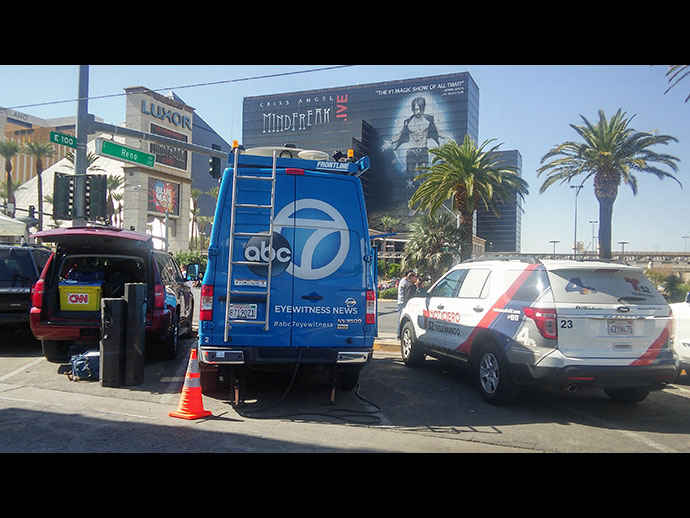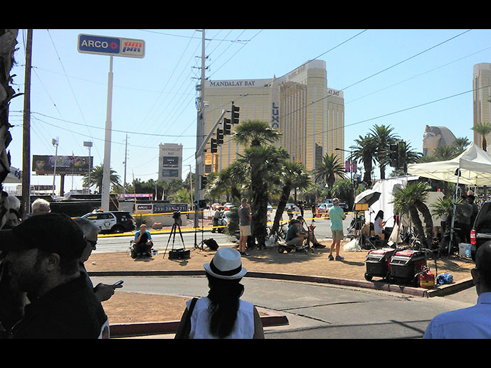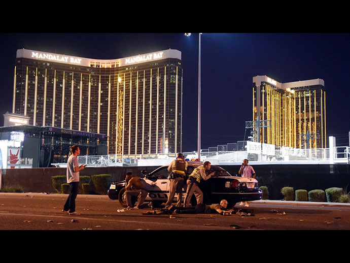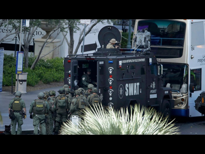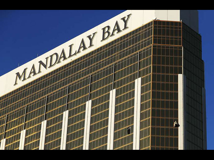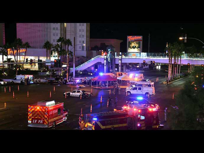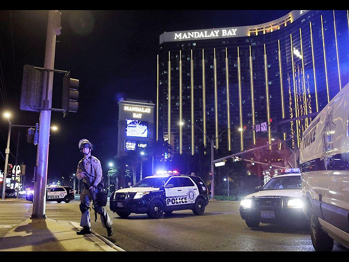 โชว์เริ่ม ๓ ทุ่มครึ่ง ความยาวชั่วโมงครึ่งไม่มีหยุดพักการแสดง ส่วนทางคอนเสิร์ทลูกทุ่งที่เทศกาลงานดนตรีเริ่ม ๓ ทุ่ม ๔๐ นาที ขณะที่คนดู ๑,๖๐๐ คนในโรงละครชั้นล่างกำลังตื่นตาตื่นใจกับเพลง แสงสี ฉาก นักกายกรรมกับเสื้อผ้าชุดแสดงสวยๆแปลกตา ภายในตึกเดียวกันบนชั้น ๓๒ คนร้ายได้เตรียมปืนไรเฟิลอัตโนมัติ ๒ ตัว ติดกล้องเล็งที่ใช้สำหรับส่องยิงสัตว์ป่า และใช้ “BUMP STOCKS” เป็นตัวช่วยในการยิงรัวได้ตลอดไม่ต้องหยุดพัก พร้อมทั้งทุบกระจกหน้าต่างทั้ง ๒ ในห้องชุดตรงหัวมุมตึก ๔ ทุ่ม ๕ นาที กระสุนชุดแรกกราดยิงโดยผู้ร้าย ๔ ทุ่ม ๑๒ นาที นายตำรวจ ๒ คนขึ้นถึงชั้น ๓๑ ของตัวตึก ๔ ทุ่ม ๑๕ นาที กระสุนชุดสุดท้ายรัวออกจากไรเฟิลสู่ด้านล่างข้ามถนนไปอีกฝั่งอย่างไม่เลือกหน้า ผู้คนหลบหนีอย่างตื่นตระหนก รวมทั้งหมดเป็นร้อยๆ นัด ๔ ทุ่ม ๑๗ นาที ทีมตำรวจไต่บันไดถึงชั้น ๓๒ ๕ ทุ่ม ๒๐ นาที หน่วย S.W.A.T บุกเข้าห้องพักเบอร์ ๑๓๕ ๕ ทุ่ม ๒๗ นาที บุกเข้าเป็นครั้งที่ ๒ ไม่พบใครอีก